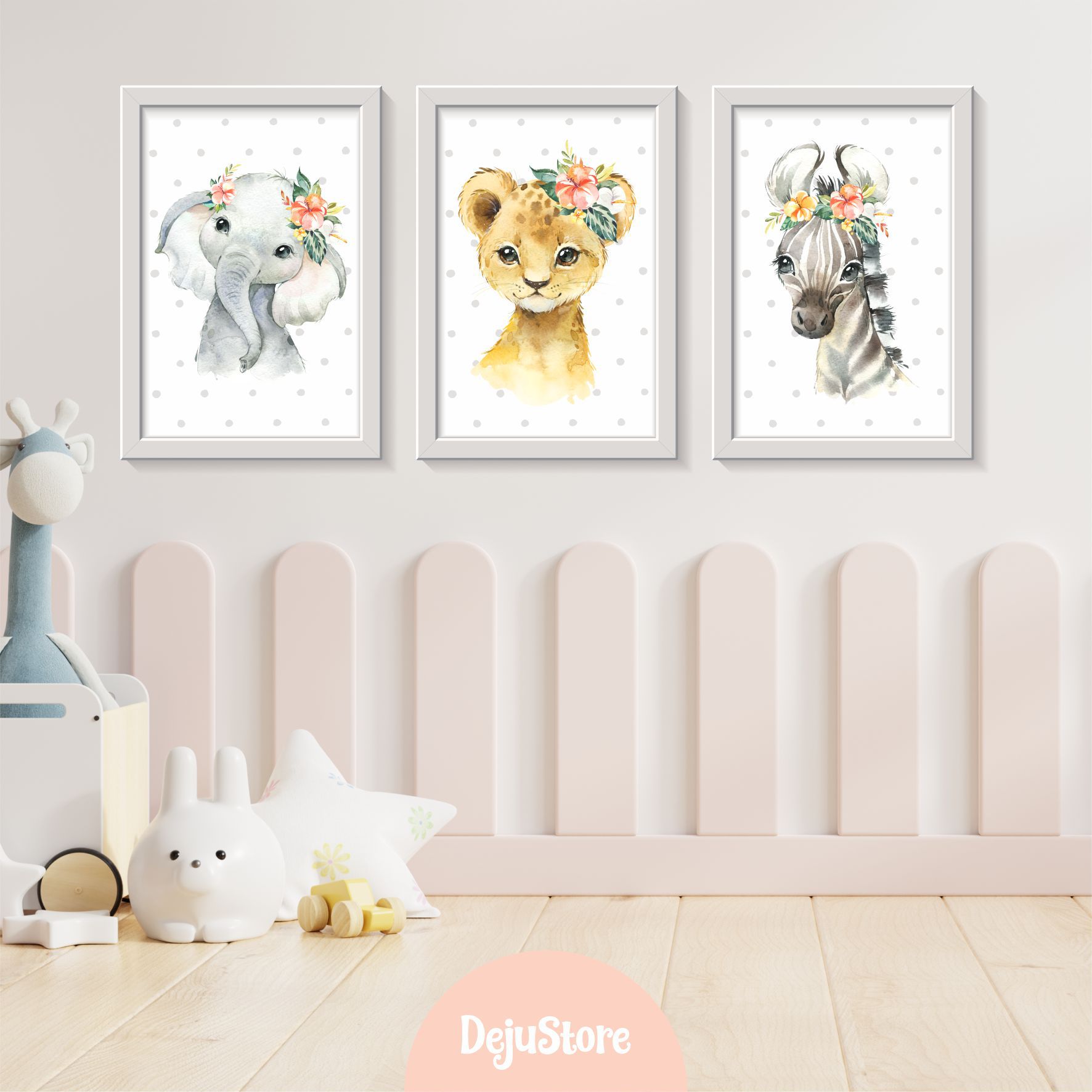 Kit Quadros: Safari Baby Menina Aquarela Poá (Elefante, Leão e Zebra)